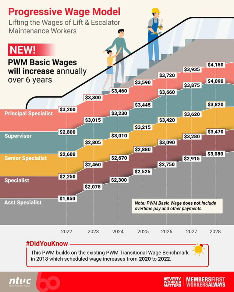 El gobierno de Singapur aceptó las recomendaciones de TCLE a favor de un modelo de salario progresivo (PWM, por sus siglas en inglés) para los trabajadores del sector de ascensores y escaleras mecánicas. De esta manera, se incrementará sustancialmente el salario base de un especialista asistente de SGD 1480 (US$ 1097), en 2021, a SGD 1850 (US$ 1371), en 2022, y este aumentará gradualmente hasta SGD 3080 (US$ 2283) para 2028.