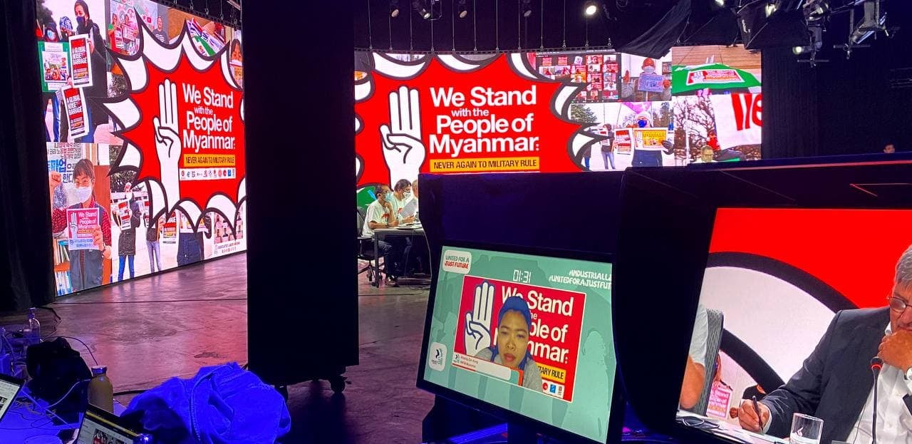 Khaing Zar, Présidente de la Fédération des travailleurs industriels du Myanmar (IWFM), a présenté la résolution sur le Myanmar, qui coïncidait avec la journée d’action syndicale internationale sur le Myanmar.