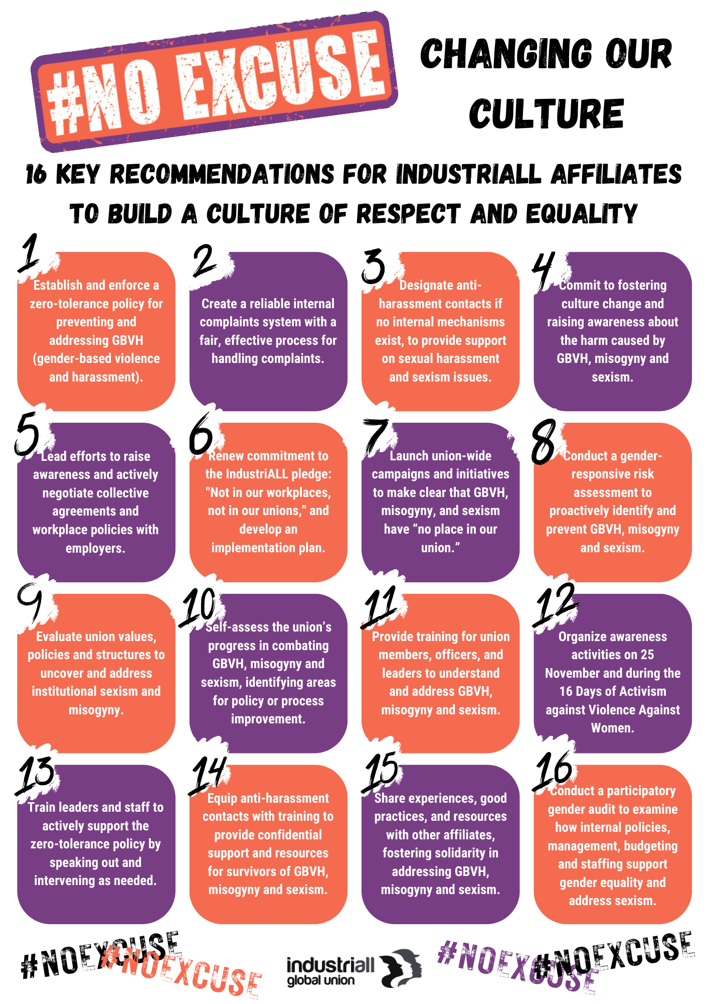 Además, en preparación de la campaña 16 días de activismo contra la violencia de género, IndustriALL ampliará su iniciativa #SinExcusas, llamando a la acción colectiva contra la violencia de género.