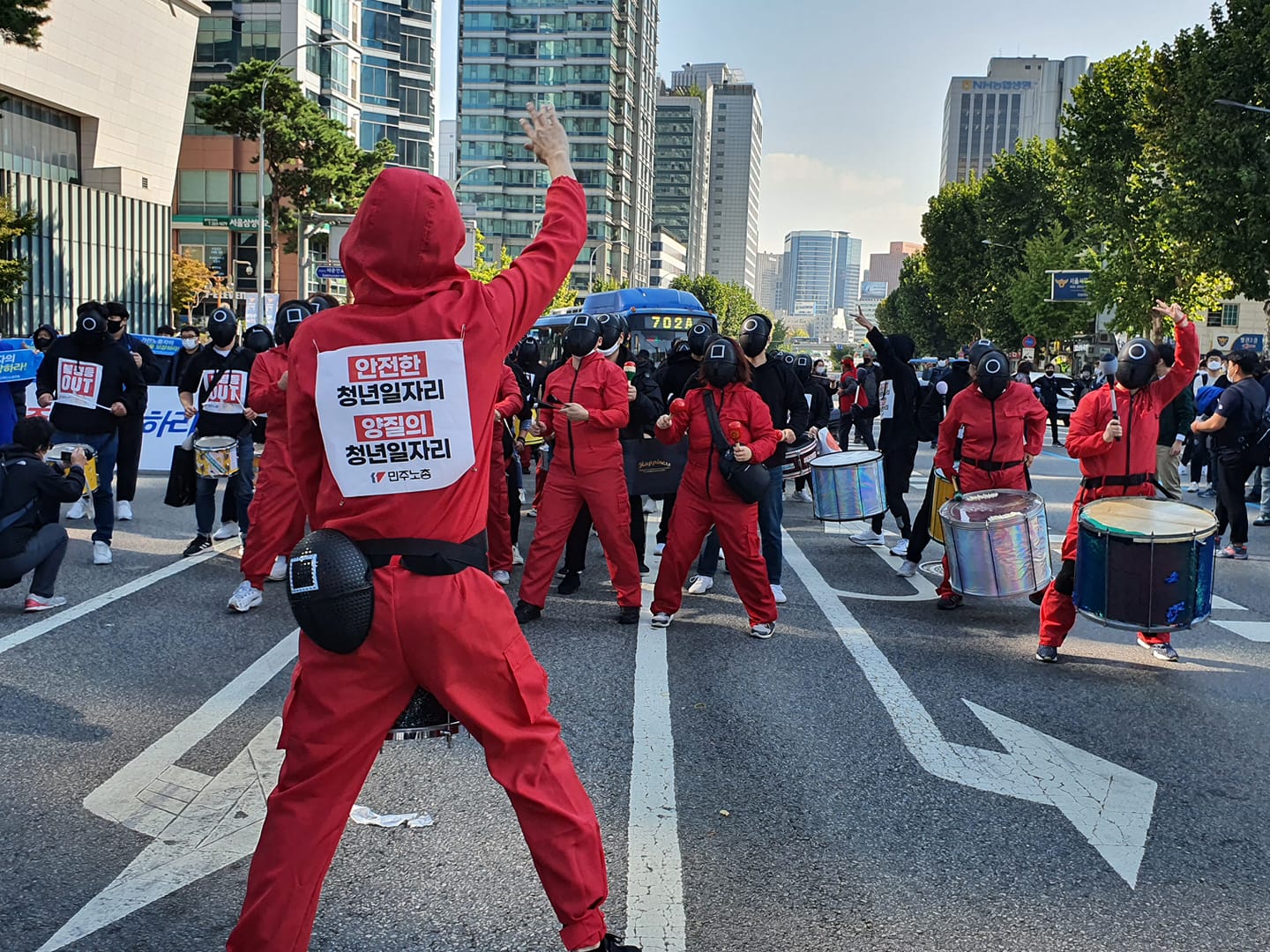 Demonstrators in uniforms from the TV series Squid Game